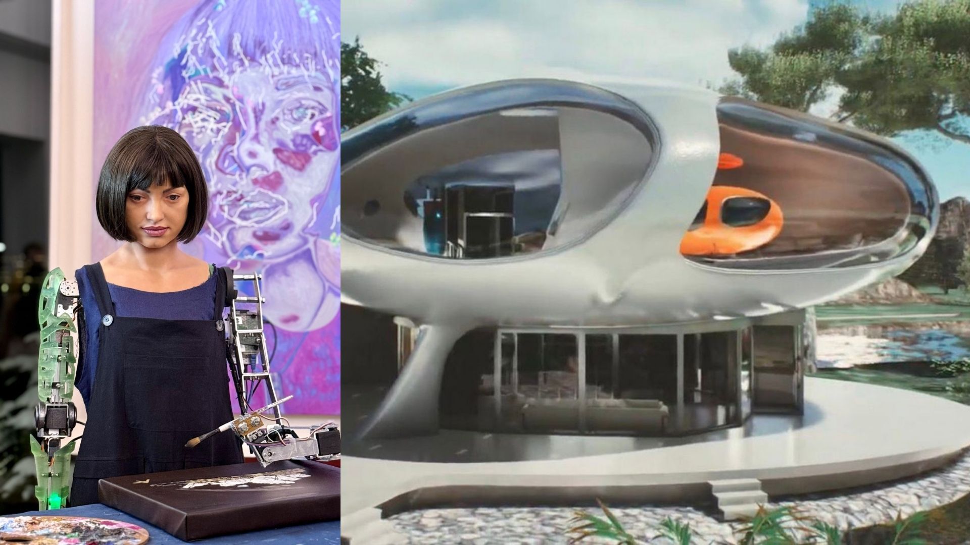 The design is a retro-futuristic pod house, inspired by 1960s space-age architecture, with curved walls, porthole windows, and even a smaller pod inside - possibly for a robot roommate. 🤖